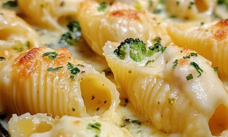 7. Combine the cooked shell pasta with the chicken and broccoli Alfredo sauce. Stir until everything is evenly coated.