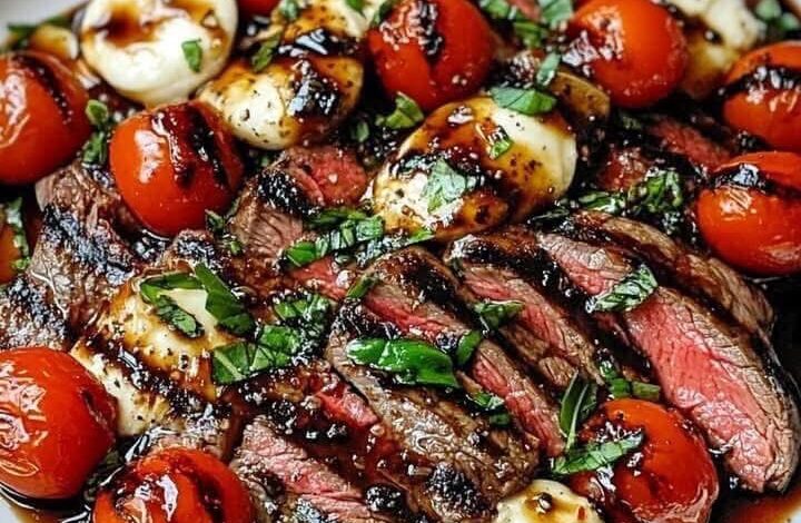 5. After the flank steak has rested, slice it against the grain. Serve it topped with the Caprese salad and drizzle with additional balsamic dressing if desired. Enjoy your delicious meal!